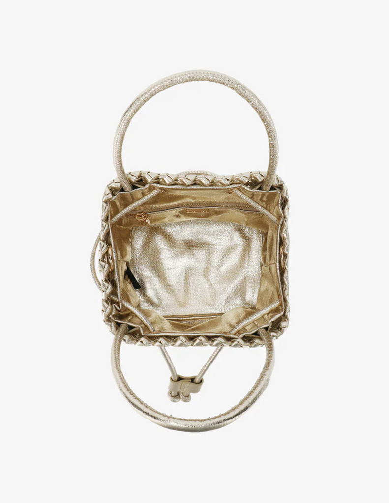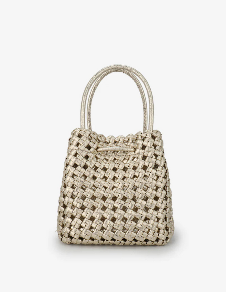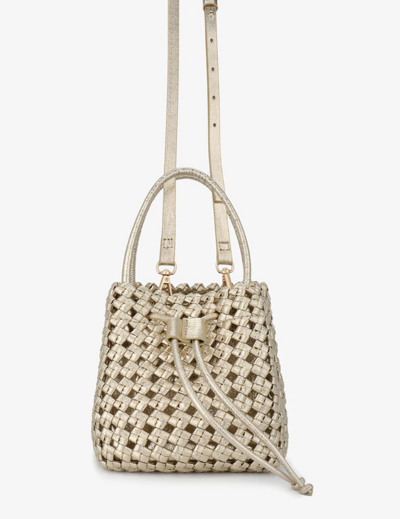 This adorable bag features a beautiful woven square pattern that gives it an instantly artisanal look. The little bucket shape has a cute top handle and cinches closed with a drawstring. It's the perfect statement piece to add a rich, stylish pop to any outfit.