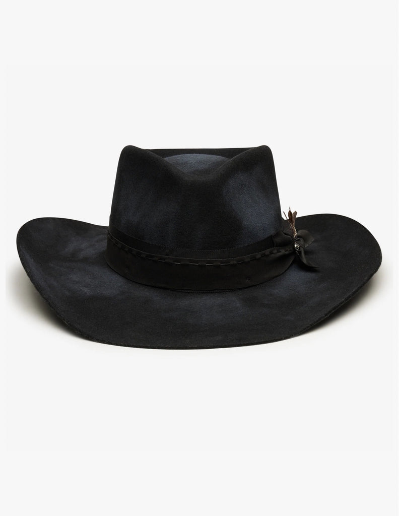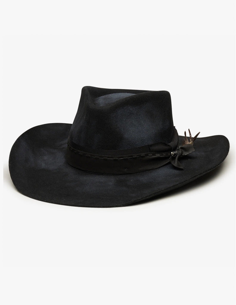 Structured silhouette, classic cowboy design, teardrop crown, upturned brim, contrast layered ribbon and feather detail, vintage effect. Made from Australian wool felt.