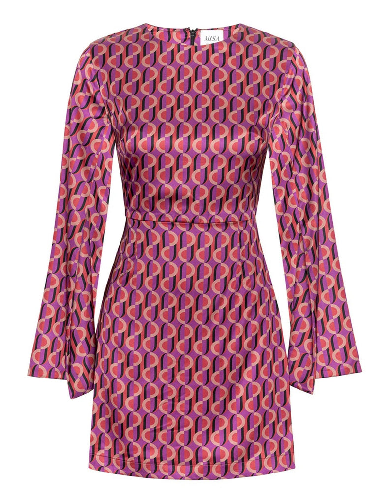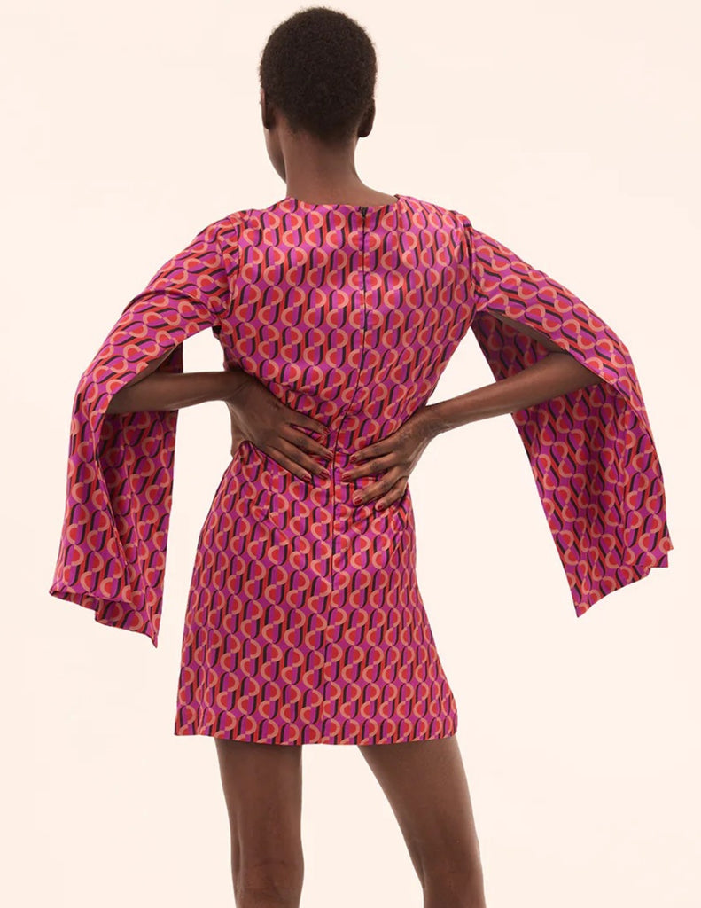Lorelei is a chic, modern mini dress cut from our graphic Geo Sixty printed satin. Featuring a high neckline, fitted bodice, and sleek straight skirt, this standout silhouette is finished with long sleeves split underneath for a subtle cape effect. Hidden back zip closure. A stunning mini to carry you through every holiday event and into the new year.