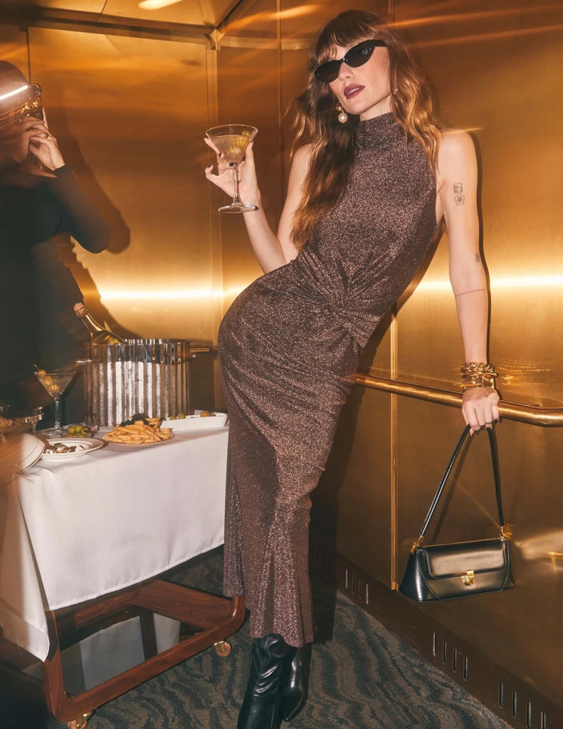 With a delicate twist front detail and metallic shine, this maxi dress was made for celebrations and evening plans.