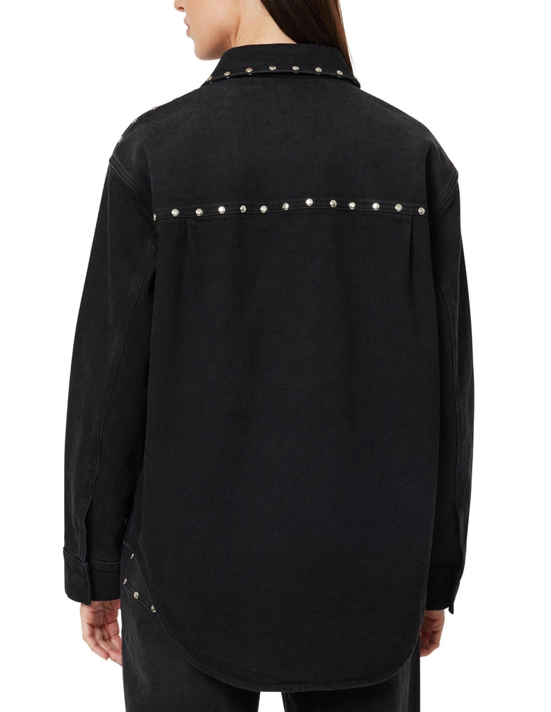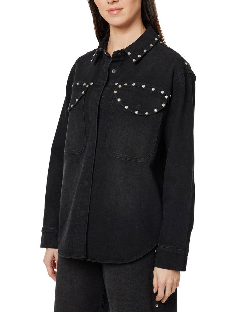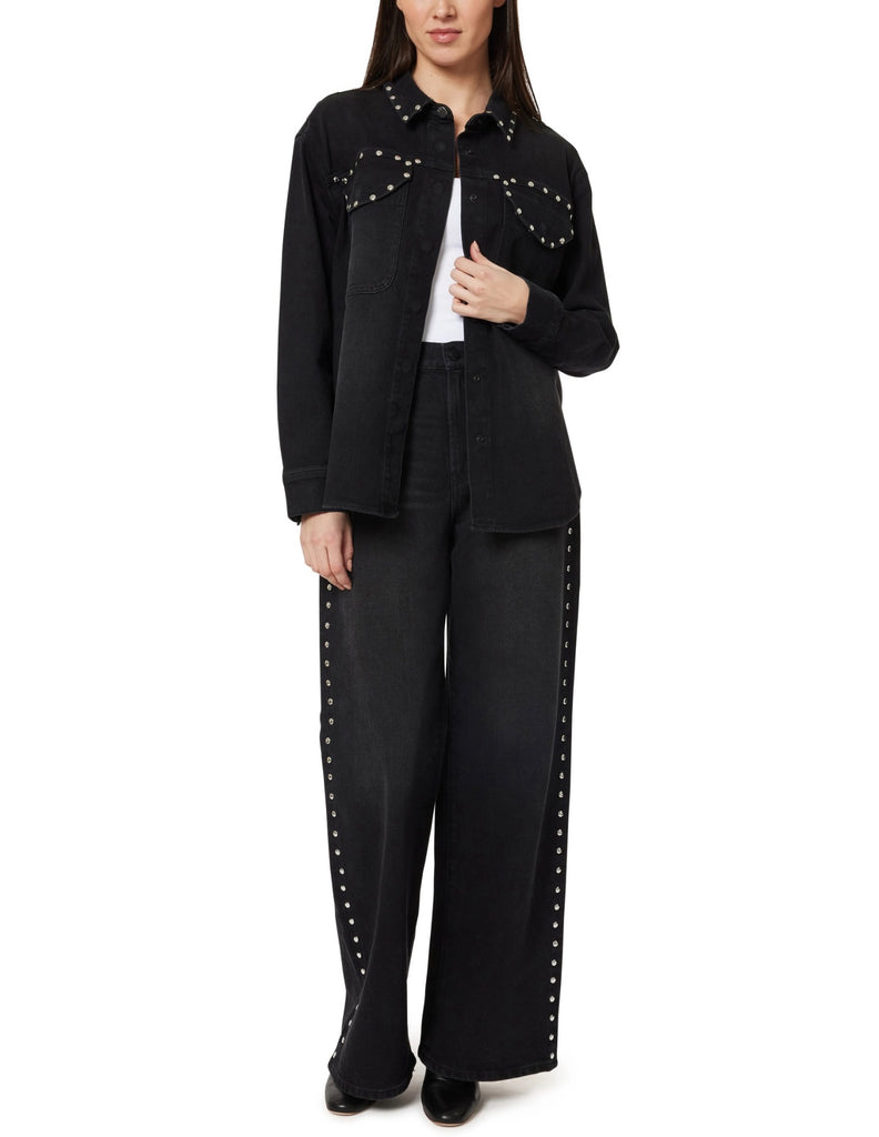Elevate your denim collection with this ultra-stylish Denim 'Shacket'. This unique piece is perfect for fashion-forward women who want to make a statement. This shirt jacket turns up the volume with bold metal stud detailing and a perfectly oversized fit. Crafted from washed denim for that worn-in vibe, it’s the ultimate layer for festivals, late-night hangs, or anytime you want your outfit to do the talking.