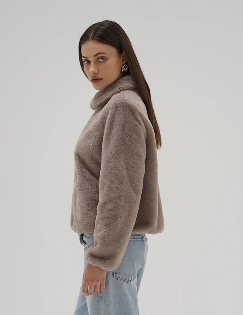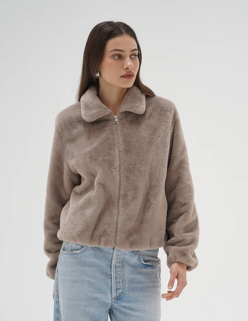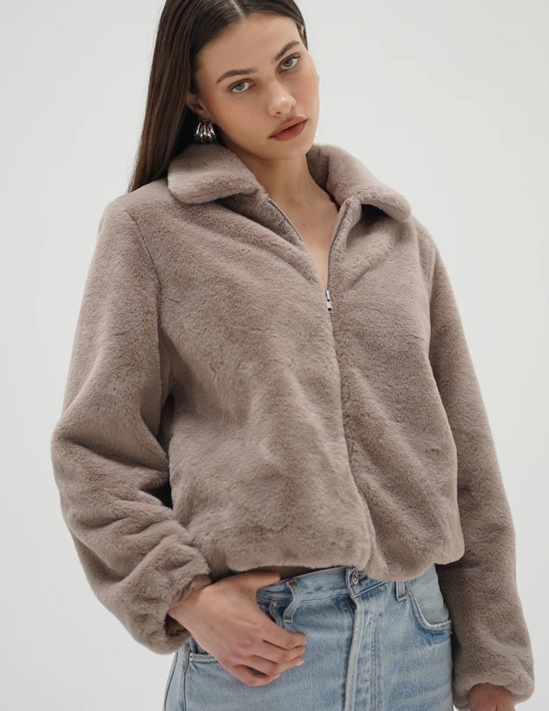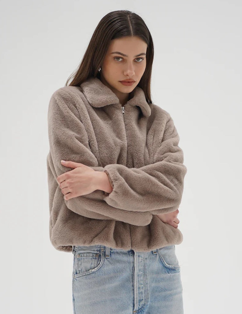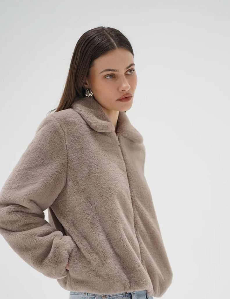 Stella is a straight cut faux fur jacket with a metal zip front.
