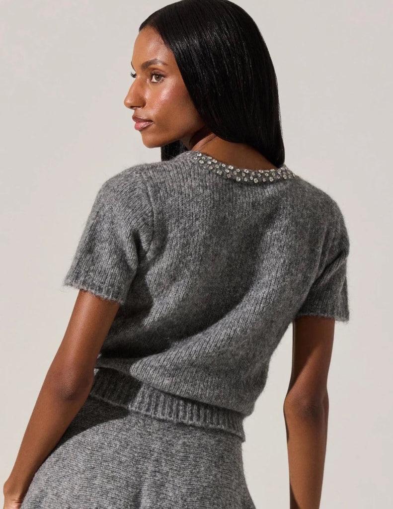 This sleeveless sweater features a round neckline embellished with Crystal Studs.
