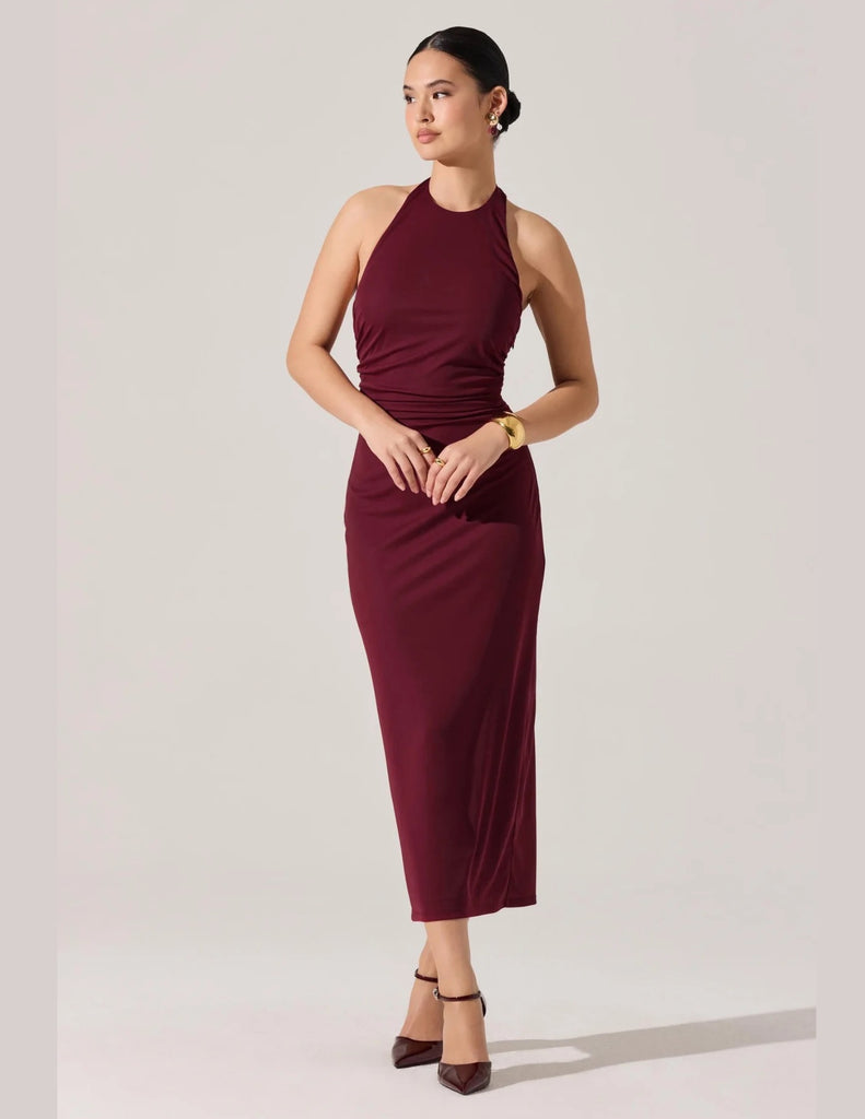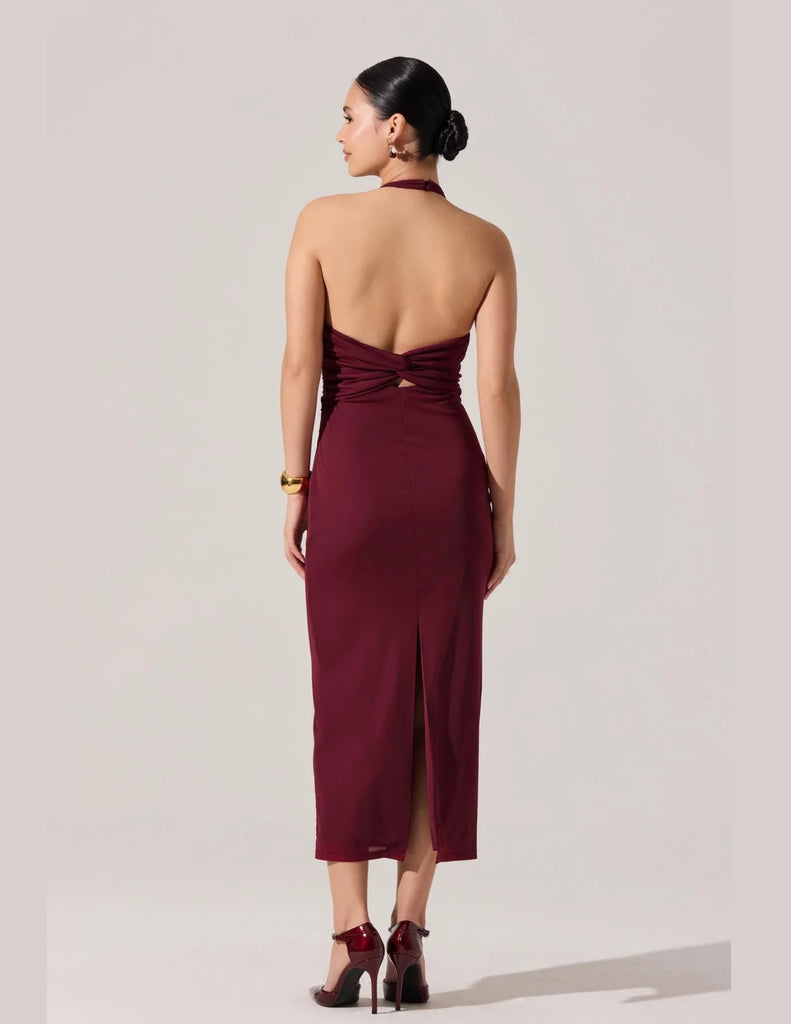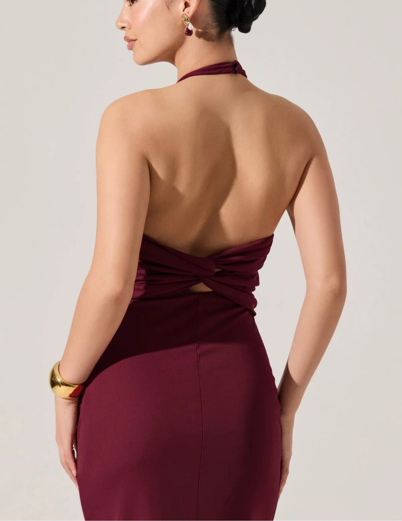 Halter midi dress with low back and adjustable cross strap tie closure.
