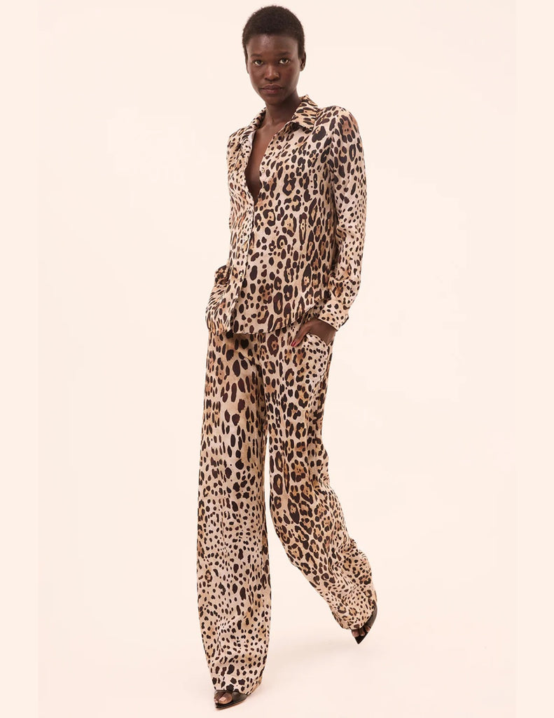 Our new Celine top is cut from a classic leopard printed satin. An elevated take on your favorite shirt, it features a classic fold-over collar and pearlized buttons for a polished finish. For a head-to-toe look, pair it with the coordinating Cher pant, or dress it down with your favorite jeans.