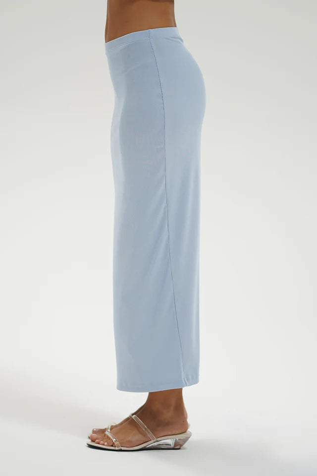 The Slater skirt is a pull on style skirt with one side slit. This skirt is made in our shine 2x1 rib fabric.