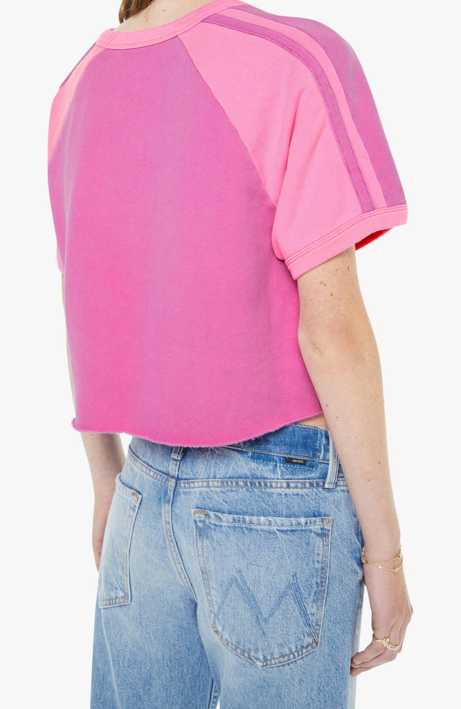 An athletic-inspired raglan tee with a crew neck, short sleeves and a cropped, raw hem. Made from 100% cotton, the Half Cut Square in Rose Violet is designed in pink with lighter panels with horizontal stripes at the shoulders.
