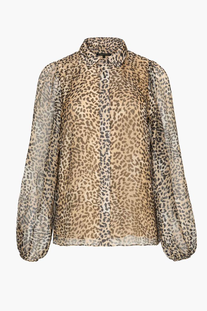 The Presley Top in Golden Leopard is a timeless statement blouse crafted from luxurious viscose silk with a soft, fluid drape. Featuring an allover leopard print in warm golden tones, this piece blends bold pattern with effortless sophistication. A classic button-down front and pointed collar give it a polished foundation, while the lightweight, slightly sheer fabric adds an airy elegance.